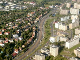 Plzeňská ulice v místě křižovatky Bílý Beránek. Foceno během přiblížení k dráze 31 letiště Ruzyně