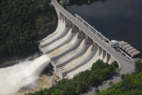 Slapská přehrada při upouštění vody přes jedno přelivové pole