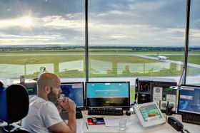 Pohled z nové ostravské věže na čerstvě nalakovaný slovenský vládní Airbus 319, který uvolňuje dráhu po krátkém záletu na pojezdovou Charlie. Řídící má před sebou systém IDP/TR7 zobrazující celkovou situaci ve vzduchu nad naší republikou a okolím za pomoci primárních a sekundárních radarů, multilateračních systémů a meteoradarů. Pravá obrazovka zobrazuje letadla a pozemní prostředky na letišti, což výrazně navyšuje kapacitu letiště při postupech za nízké dohlednosti (LVP) a bílá menší obrazovka napravo je komunikační systém spojující funkci telefonu a rádií dohromady.